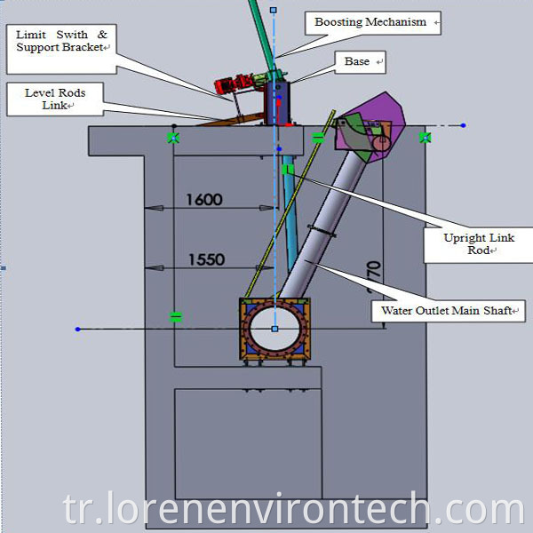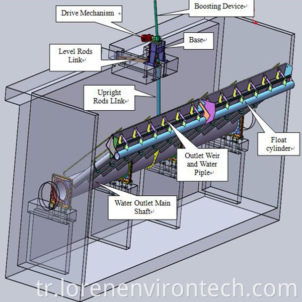 Döner dekanter destekleyici yataklarla parantez tabanı içindeki havuza monte edilmiştir. Elektrikli itme çubuğu yavaşlama cihazı iç havuzun üzerindeki desteğe monte edilmiştir. Elektrikli itme çubuğu, daha düşük desteğin merkezinde dönüp sallanmaya yönelik boşaltma mekanizmasını yönlendirir. Havalandırma ve sedimantasyon aşaması sırasında, akarsu yoksul su yüzeyinin üzerinde bulunur. Çıkarma sırasında, boşaltma savunu, drenaj için kontrol sistemi tarafından su yüzeyinin altına indirilir. Çıkartma tamamlandığında, sürahi hızla başlangıç durumuna geri döner. Çıkartma işlemi önceden ayarlanmış prosedüre göre gerçekleştirilir. Çöken savaktaki su akışı laminer akış durumundadır. Dahlinin azalan hızı, su çıkışını sabit tutar.