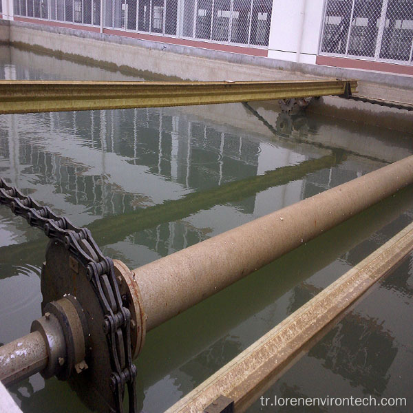 Zincir tipi çamur kazıyıcı, su yüzeyinde yüzen askıda katı maddeleri ve havuzun altındaki çamurları sürekli olarak uzaklaştırmaktır. Sıyırıcı havuz yüzeyi ve havuzun tabanı boyunca hareket eder ve asılı katıları sıvı yüzeyin giriş ucundan çıkış ucuna iter. . Zincir tipi çamur kazıyıcı zincirin her iki ucunda sabitlenir ve zincir tipi çamur kazıyıcı bir tahrik zincir dişlisi iletim cihazı tarafından tahrik edilir. Zincir kazıyıcı, tankın tüm genişliği boyunca hareket eder, kirleticileri cüruf deşarj tankına kazıyır ve çamuru çamur haznesine kazar.